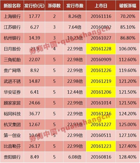统计数据显示,打新新规实施以来,新股上市后涨停板数不多于5个的新股共有14只,分别是上海银行、江苏银行、杭州银行、日月股份、三角轮胎、贵广网络、武进不锈、华安证券、顾家家居、裕同科技、杭叉集团、第一创业、比音勒芬、贵阳银行。