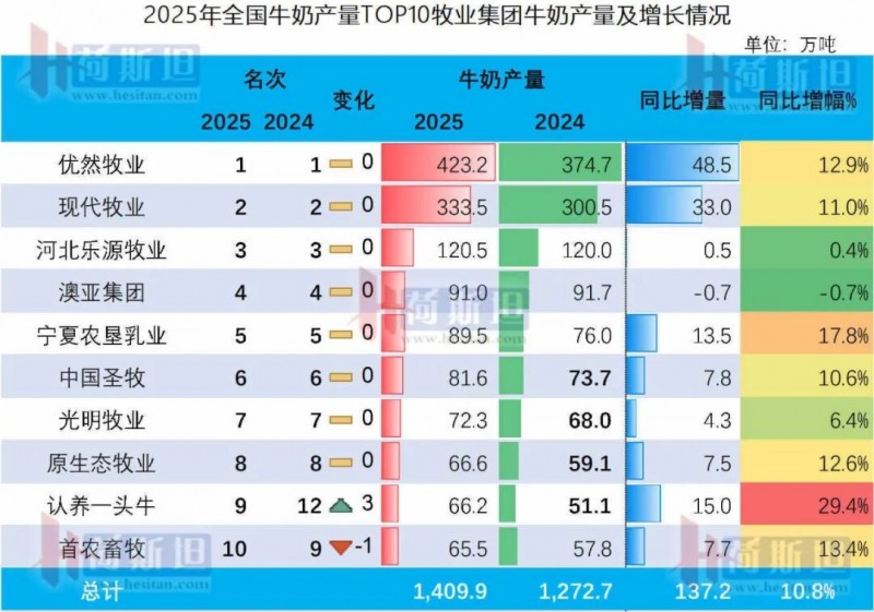 2025年,行业整体进入去产能调整周期,Top10牧业集团产量门槛首次突破65万吨。作为一二三产业高度融合的大型农业全产业链集团,认养一头牛不仅成功跨越这一门槛,以66.15万吨的年产量,从2024年的第十二位跃升至第九位,更以29.4%的同比增速,成为Top10榜单中增速最快的企业。