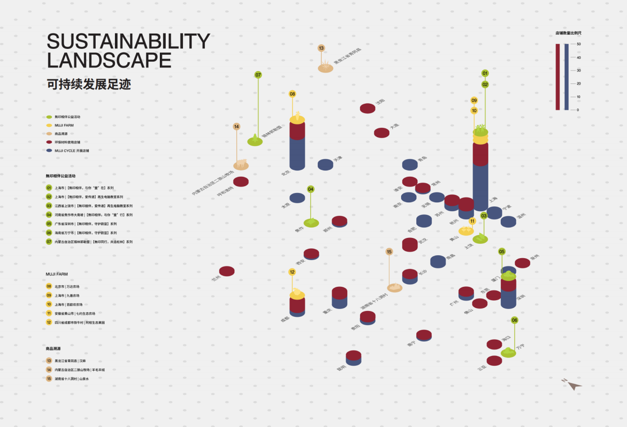 今年的《回顾》升级了视觉呈现形式,首次引入“可持续发展足迹”这一可视化工具,以地理维度串联MUJI在本土的一系列可持续发展实践,将分散的行动整合为一张清晰的可持续发展图景。