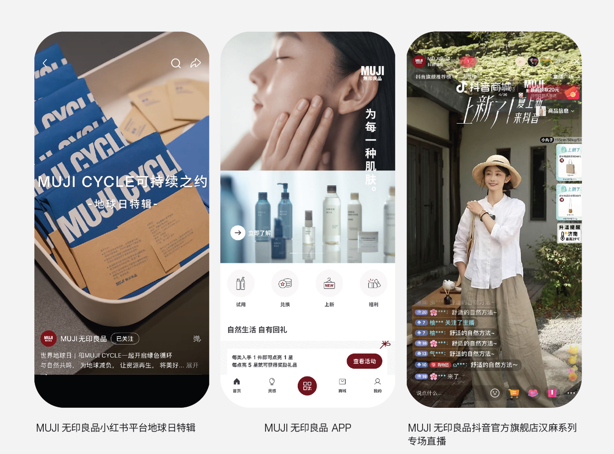 MUJI在推动可持续发展理念走向更深入实践的同时,也对如何增强与消费者联结、带来更积极的认同、提高理念传播的影响力做了更全面的思考。MUJI规划多元化的传播渠道,通过小红书、抖音等社交媒体平台,官方APP等自有渠道,与消费者建立多元的日常联结。通过用户视角与真实体验,传递“感觉良好的生活”的愿景。