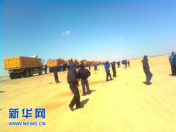 2月26日,中铁十一局五公司组织员工撤离利比亚铁路项目工地,分乘数十辆工程车,组成车队前往利比亚米苏拉塔港。新华社发(梁胜利摄)