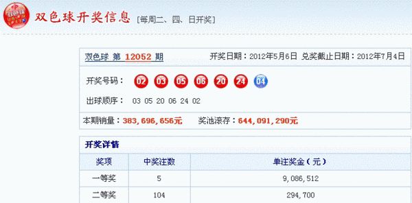 北京时间2012年05月06日晚,福彩双色球第12052期开奖,当期的开奖号码为:红球 02 03 05 06 20 24,蓝球04。。当期一等奖开出5注,每注奖金约为908万;二等奖开出104注,每注奖金约为29万。本期销量约为3.83亿,计奖结束后奖池余额6.44亿。