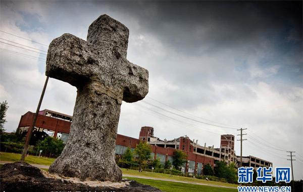 当地时间2010年8月11日,美国底特律,一处废弃建筑前的十字架。从1950年起,底特律的人口已经减少了1/3,由于城市的失业率超过10%,预计到2030年前,人口都会持续缓慢但稳定地减少。在2100年前,底特律可能已经面目全非。