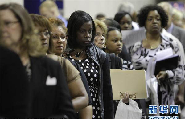 2010年10月25日,美国底特律,大批求职者排队等待进入招聘会现场。汽车之城失业率高企,人口由黄金时期过百万人大幅下跌至约70万人,犯罪率亦十分严重。现时底特律只透过发债来应付日常营运开支,累积逾140亿美元退休金及市政府员工的离职后福利等长期债务,难怪早前被《福布斯》评为本年美国最不幸的城市。