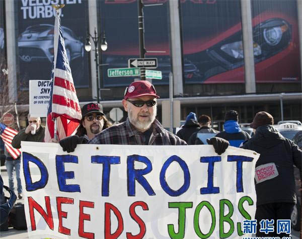 当地时间2012年1月8日,美国底特律,据底特律当地媒体报道,愤懑的美国汽车工人在汽车城底特律进行游行示威活动,而这正好是一年一度的北美国际车展召开的前一天。汽车之城失业率高企,人口由黄金时期过百万人大幅下跌至约70万人,犯罪率亦十分严重。现时底特律只透过发债来应付日常营运开支,累积逾140亿美元退休金及市政府员工的离职后福利等长期债务,难怪早前被《福布斯》评为本年美国最不幸的城市。