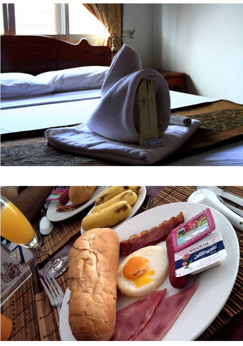 说心里话,这家小旅馆还是很不错的,打扫得纤尘不染,环境也不错,只是离河边区域略远。30刀/晚带空调热水含早餐,是在万象不错的选择。它家的早餐虽然是set,但是量足味美,法棍是欧们在老挝吃过的最松脆好吃的,和越南可以一比,果汁咖啡还都可以续杯,第二天我还吃了它家的黄面米粉,超级好吃,做早餐的女服务生也是我在老挝遇到的最友好最善良的姑娘!