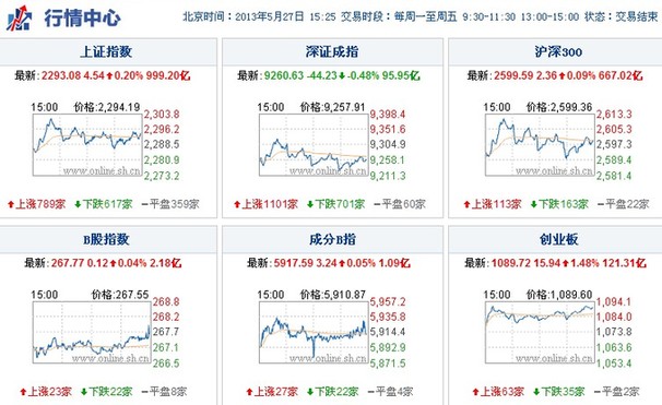 监测数据显示,今日上证综指开盘2286.66点,最高2301.70点,最低2283.94点,收报2293.08点,上涨4.55点,涨幅0.20%,成交999.20亿;沪市565家上涨,384家下跌;今日深证成指开盘9278.22点,最高9323.21点,最低9223.72点,收报9260.63点,下跌44.23点,跌幅0.48%,成交1240.46亿;深市1112家上涨,550家下跌。