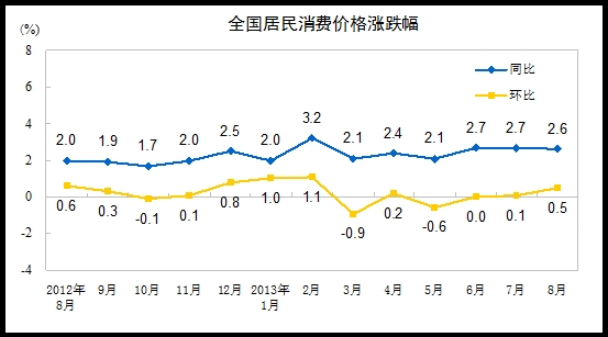 2013年8月份,全国居民消费价格总水平同比上涨2.6%。其中,城市上涨2.5%,农村上涨2.9%;食品价格上涨4.7%,非食品价格上涨1.5%;消费品价格上涨2.5%,服务价格上涨2.7%。1-8月平均,全国居民消费价格总水平比去年同期上涨2.5%。