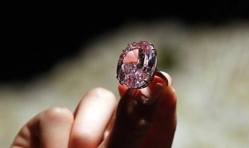 当地时间2013年10月24日,英国伦敦,图上展示的是一枚镶了粉钻的戒指。据悉颗粉钻有59.6克拉之重,是美国宝石研究所评估过的最大的切割后无暇粉色钻石。这枚戒指计划于11月13日在苏富比华丽珠宝日内瓦分店销售,售价为6千万美元(约3.6亿元人民币).