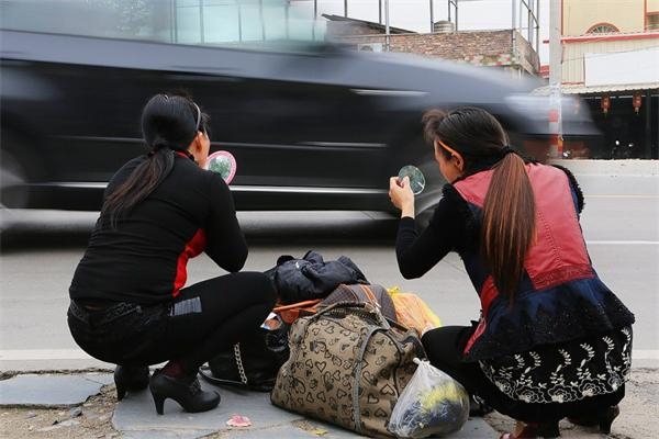 哭灵结束,死者还在送往殡仪馆的路上,哭灵人蹲在路边就地卸妆