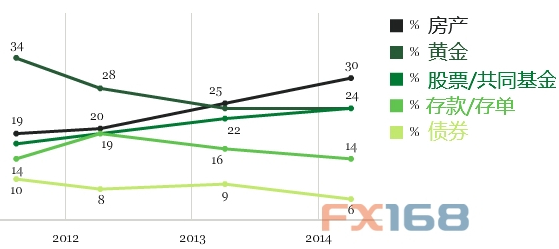 低收入的投资者们继续对黄金保有信心,不过盖洛普调查中,覆盖所有受调查者的数据显示,有30%的投资者倾向于房产。股票和黄金同样占比24%,排名第二,接着是存款和存单,占比14%,最后是选择债券的6%。在2011年和2012年,黄金是最受欢迎的投资。