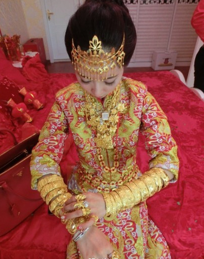 @广东顺德-华少:顺德婚嫁,戴金习俗,从经济角度上讲,给新娘金器远比所谓的排场气场要好,金器是保值增值产品,几万几十万的价值不会消失,而排场,少则花费几万多则几十万(请明星租豪车)第二天即消失殆尽无影无踪。