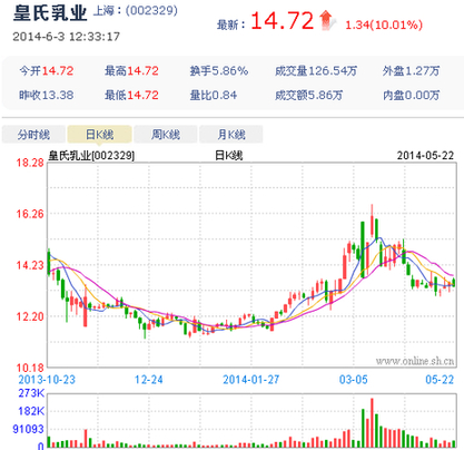 继收购御嘉影视后,皇氏乳业(002329,前收盘价13.38元)在转型路上再接再厉。公司今日宣布,拟对北京盛世骄阳文化传播有限公司(以下简称盛世骄阳)、北京北广传媒高清电视有限公司 (以下简称北广高清)两家公司进行股权投资。皇氏乳业股票自6月3日开市起复牌。