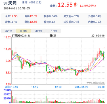 6月10日,天润控股(002113,收盘价11.41元)迎来重组复牌后的第一个交易日,股价开盘即遇“一字”涨停。