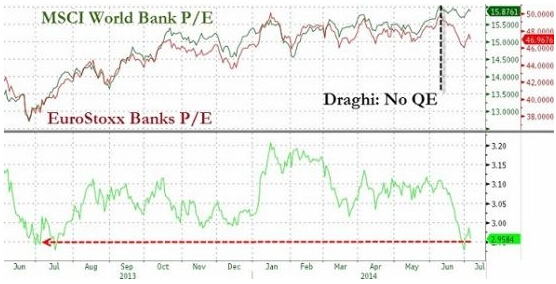 事实上,欧洲银行业正处于困境,每股收益下跌,导致投资逃离欧洲债市(融资成本将上升,欧债危机起因。因此如果欧洲央行不推出QE,仅用LTRO无法改变现状。
