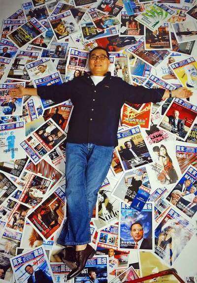 2010年,邵忠,中国著名媒体人,现代传媒出版集团的创始人和董事长。他正躺在20年间公司出版发行的图书和期刊上。