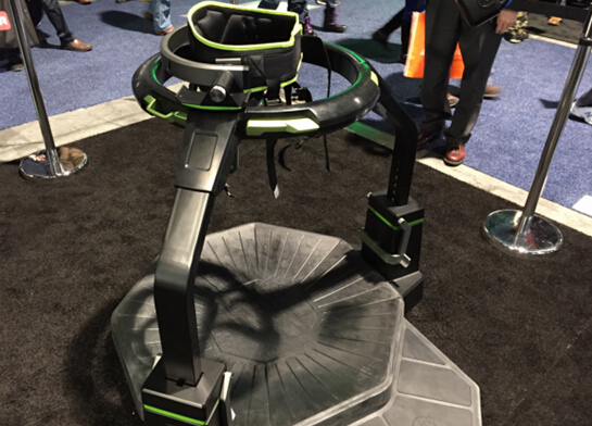 Virtuix Omni虚拟现实全向跑步机,能够360度全向跑动,将玩家的运动同步反馈到实际游戏中,将人的方位、速率和里程数据全部记录下来并传输到游戏当中,在虚拟世界中做出对现实反应的真实模拟。。Omni 展示的是射击游戏,搭配oculus DK2和游戏枪械。