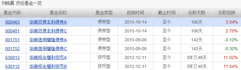 刘晓晨:1999年9月至2001年12月,就职于泰康人寿保险股份有限公司北京分公司,任团体业务管理员;2004年6月至2010年7月,就职于瑞泰人寿保险公司总公司,历任投资分析师、高级投资分析师及固定收益助理经理。2010年7月,加入华商基金管理有限公司,任宏观策略研究员、债券研究员。2012年9月21日,转入投资管理部任职,2012年12月11日起至今担任华商现金增利货币市场基金基金经理,2015年9月8日起至今担任华商信用增强债券型证券投资基金基金经理,2015年7月21日至2015年10月13日担任华商双债丰利债券型证券投资基金基金经理助理。