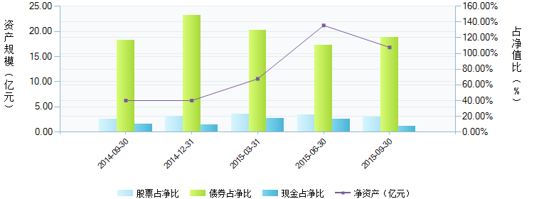 截至2015-12-31,华商双债丰利债券A 净资产规模42.07亿元,比上一期(2015-09-30)增加了150.01%,股票配置占比上期减少9.45%