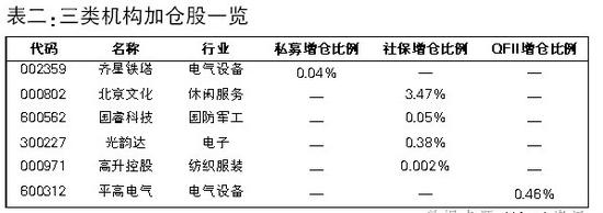 通过进一步的统计,记者还发现,有三只个股被三类以上的机构共同持有,分别是三诺生物、花园生物和平高电气。其中,三诺生物由公募、私募和社保分别持有3.75%、2.65%和1.37%;花园生物由公募、社保和QFII分别持有1.48%、5.88%和1.06%;平高电气由公募、社保和QFII分别持有1.33%、0.98%和0.96%。