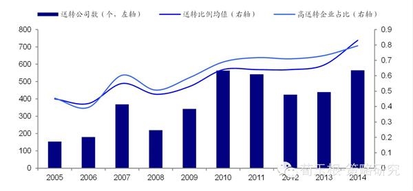 送转企业的数量和高送转企业比率在持续提高。从2005年以来,A股年报送转的企业数量不断提高,05年推出送转的上市公司仅154家,而近5年来平均每年送转企业数量平均在500家左右,2014年送转企业数量达到565家。送转企业数量增加的同时,平均的送转比例也在不断提高,从2005年的0.45(即平均10股送转4.5股)提高到2014年0.83(10股送转8.3股)。高送转企业的比例也同样在不断提高,按照上交所《第九十五号上市公司董事会审议高送转公告》中将“高送转”定义为每10股送转5股以上的定义来划分,05年高送转企业的占比仅45%,而2010年以来高送转企业比例基本在70%以上。2014年565家送转企业中,有449家企业送转比例高于0.5(10股送转5股),高送转企业占比达79%。