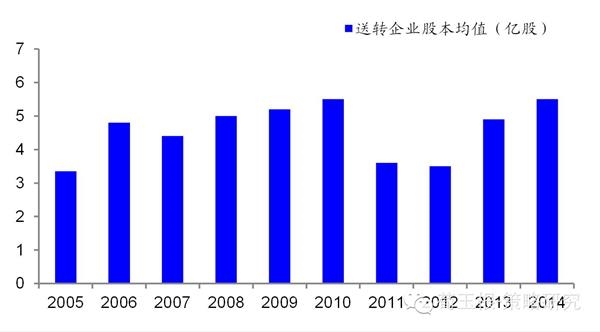 送转企业股本均值低于5.5亿股。由于总股本较小的公司在选择送转比例和送转方式上相比大蓝筹公司更加灵活,因而送转比例更高,尤其是对于中小板、创业板公司而言。统计2005年以来,送转企业股本均值基本维持在5.5亿股以下。