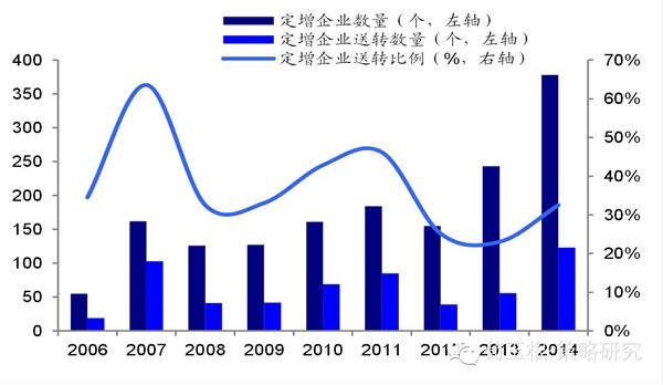 定增井喷将使高送转企业数量上升。企业在定增之后,有较高盈余资本金,高送转能力较强,倾向于高送转以刺激股价,回报参与定增的投资者。08年以来,定增企业中平均有30%以上会推出高送转。尤其在市场行情较好的年度,定增企业中送转的比例会更高,如2007年有64%的定增企业实施送转,2010年、2011年定增企业送转比例也分别高达43%、46%。2015年企业定增数量井喷,共有712家企业实施定增,总共募资额度达到1.16万亿,数量和金额都远高于2014年。2015年定增的爆发也将带来高送转企业数量的大幅提高。