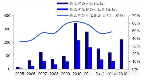 次新股高送转潜力更大。除了定增以外,次新股也有较高的送转比例。由于新上市公司在发行新股时都得了较高的股票溢价收入,因此尽管次新股在可分配的利润可能不多,但由于有较高的资本公积。因此次新股的送转比例更高。从2007年以来,新上市企业的送转比例基本在50%以上。2014年上市的125家公司中有61家推出送转。2015年共有224家新股上市,2015年三季报显示这些次新股平均每股资本公积为2.7元/股,具有很强的送转潜力。