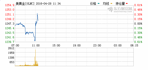 黄金短线急涨7美元。