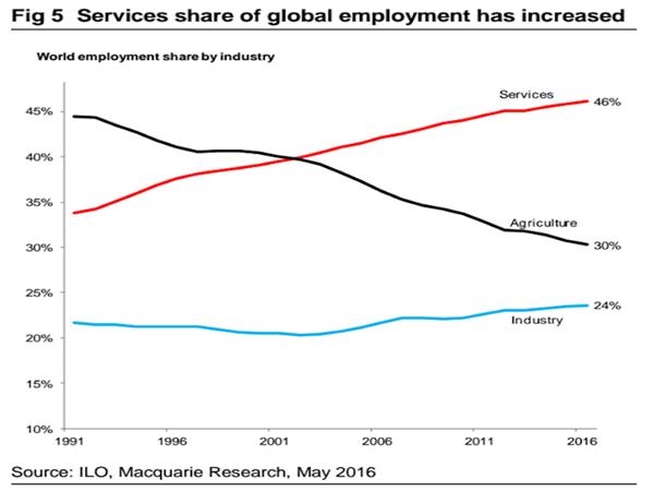 2016年,服务业就业占全球就业总量的比例已经从1991年的34%飙升至46%。根据由大卫·道尔带领的麦格里团队在近期给客户的一份报告中所说的,在过去的25年里,全球创造的十亿个新增就业岗位中有75%来自于服务业。