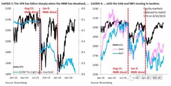左图显示了当人民币贬值时标普指数暴跌,右图则显示了达克斯和日经指数同步波动。
