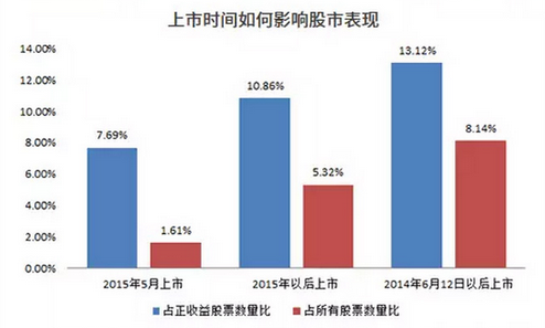 221只正收益股票中,17只是2015年5月上市的,占比7.69%;24只是2015年以后上市的,占比10.86%;29只是2014年6月12日以后上市的,占比13.12%。