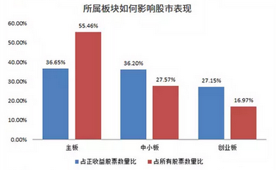 而在所有2728只股票中,1513只在主板上市,占比55.46%;752只在中小板上市,占比27.57%;463只在创业板上市,占比16.97%。