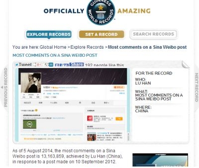 2014年8月,鹿晗的微博单条评论数突破千万条,并因此获得吉尼斯世界纪录。