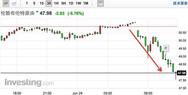 截止北京时间12:00,布伦特原油跌近6%,失守50美元关口,现报47.98美元。
