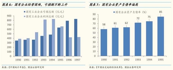 90年代以来,中国国有企业经营状况不佳,资产负债率偏高,债务负担很重,国有企业陷入债务困境.1990年以来国有工业企业亏损额不断上升, 1997年共亏损830.95亿元,是1990年的2.4倍。1996-1997年,国有工业企业亏损金额甚至高于其利润总额。同时,国有企业资产负债率也在不断上升,在1995年高达85%。经营不佳加上高负债率,使得企业债务负担压力很大,国有企业陷入债务困境。