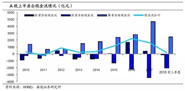 二是销售回款减少正带来内部现金流的回落,今年地产销量增速持续下滑,特别是三四线商品房销量增速处于低位,销量的低迷使得企业经营现金流出现回落,今年前三个季度上市房地产公司经营性现金流净额为负,销售回款的减少已经严重影响到了企业的资金流。