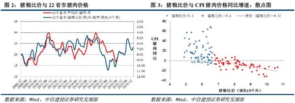 从定量角度看,猪肉价格的变动幅度跟主粮比价的关系跟猪粮比价数值有很大关系。如果猪粮比价过低,则意味着养殖利润过低甚至亏损,养殖户补栏意愿下降,未来的猪肉供应不足进而猪肉价格上涨压力过大。2009年国家出台猪价调控措施后,猪粮比价盈亏平衡点一度设定为6:1,2015年的《缓解生猪市场价格周期性波动调控预案》(2015年第24号公告)则将猪粮比价盈亏平衡点下调至5.5∶1至5.8∶1。从实践中看,当猪粮比价低于6.5∶1,15个月之后的猪肉价格上涨幅度明显并且弹性很大,同比增速甚至可以超过60%,跟猪粮比价的具体数值似乎并无直接关系。如果猪粮比价高于6.5∶1,则猪粮比价跟猪肉价格有较为稳定的负向关系。