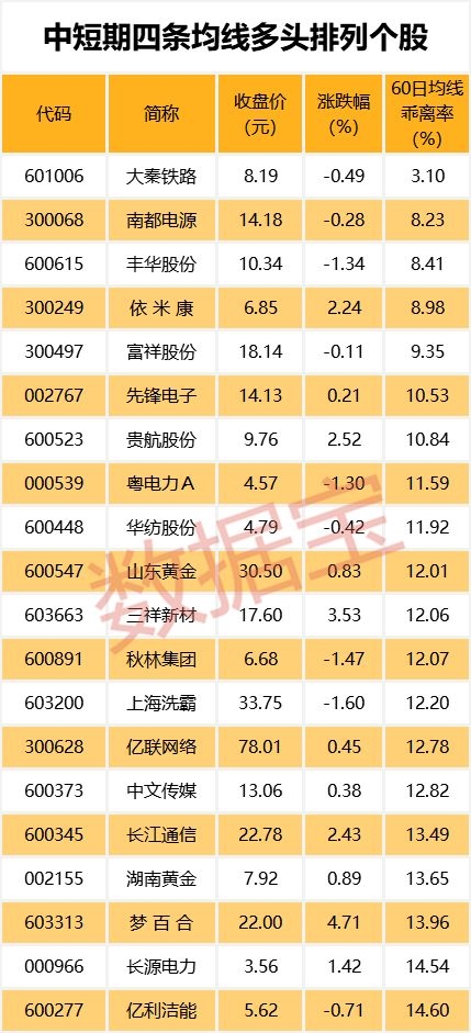 一般来说,均线多头排列代表买方力量强大,后市由多方主导行情概率较大。两市目前共有48只个股5日、10日、20日、60日四条均线近日呈多头排列。其中 大秦铁路、南都电源、丰华股份股价与60日均线的乖离率最小,分别为3.1%、8.23%、8.41%。