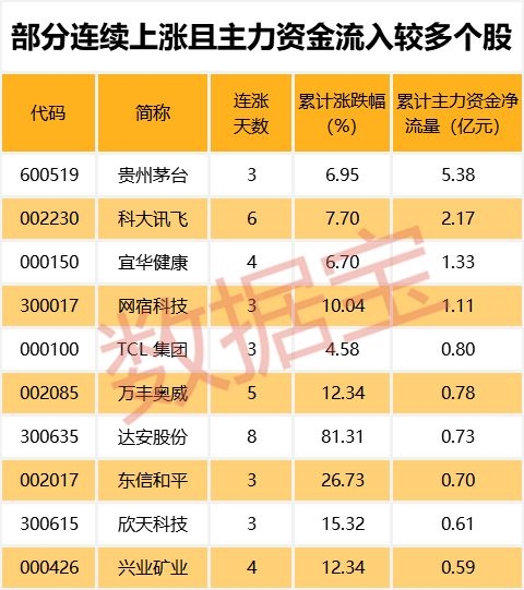 值得注意的是,82只连续上涨个股中,4只个股期间主力资金累计净流入超过亿元。其中,累计资金流入最多的为贵州茅台,主力资金累计流入5.38亿元。