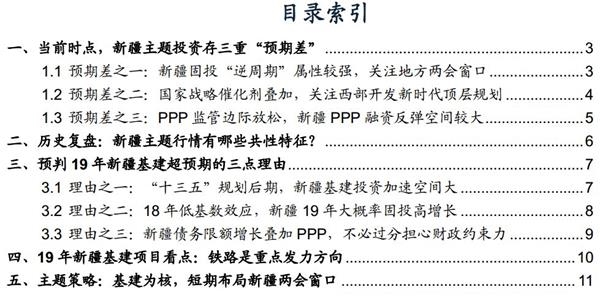 回顾03年以来新疆投资周期,可以发现:每当宏观经济进入下行期,基建“补短板”政策加码,并向西部倾斜力度较大,新疆固投增速具备一定“逆周期”属性。08年为了应对金融危机,“4万亿”下09年初新疆基建投资率先加码;11-12年,宏观经济“软着陆”,西部大开发战略加速,新疆固投增速明显高于全国; “一带一路”战略深化背景下,17年1月底新疆两会提出1.5万亿固投目标。18年“去杠杆”以来,非标、PPP等融资手段大幅减少,新疆固投增速达到历史低点,我们认为,伴随GDP目标进一步下调,货币政策效果有限,基建对冲是财政政策重要发力点,加速“宽货币”向“宽信用”传导,其中西部区域(特别是新疆)基建将迎来高增长点。按照新疆固投“十三五”规划目标年均12%增速来看,叠加18年“低基数”效应,预计19年新疆固定投资增速很可能大幅回升。