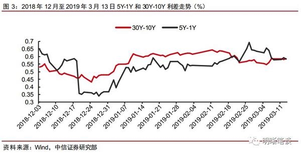 这两段较短期限券种收益率走低的原因分别为资金面宽松和政策面、基本面配合。综合2019年1月上旬利率债收益率的走势和背后的推动因素来看,我们认为5Y-1Y利差在年初走扩有两大原因,一是跨年结束叠加降准和定向扩围带动资金面宽松,1Y收益率跟随资金面宽松下行,二是1月地方债发行较多且当时地方债较同期限国债利率+40bps的优势仍在,而当月地方债发行以5Y以上期限居多,因此配置盘对地方债青睐对5Y国债形成挤压,导致1Y国债收益率下行而5Y收益率上行。30Y-10Y利差走扩则相对单一,即货币政策宽松、财政宽松不及预期、经济金融数据等因素的下行的共同作用带动各期限中最为活跃的10Y券种收益率下行,而30Y上行幅度相比5Y可忽略不计。