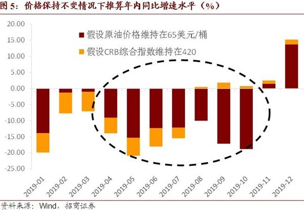 如果我们从这一简单的量化模型出发,PPI同比增速见底需要满足什么条件?如果原油价格与CRB指数所衡量的其它国际大宗商品价格维持在目前的价格水平之上,我们可以推算出两者在年内相应的同比增速水平如下图所示, 年内PPI同比再创新低确实是相对较大概率的事件。