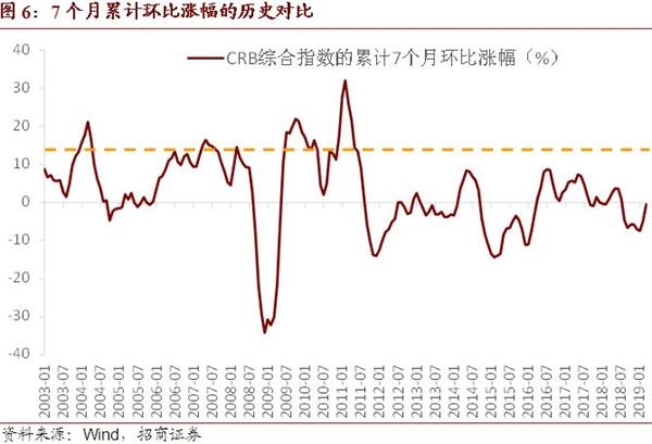 如果我们的模型是可靠的,根据前面我们估算出的回归模型,并假设布油价格维持在65美元/桶,我们可以算出相应的CRB综合指数同比增速必须在今年10月份接近16%,相应的CRB综合指数大概在480,才能明显抵消大部分油价对PPI同比的拉低效果, 这意味着未来7个月时间内CRB综合指数的累计环比涨幅必须达到14%左右。