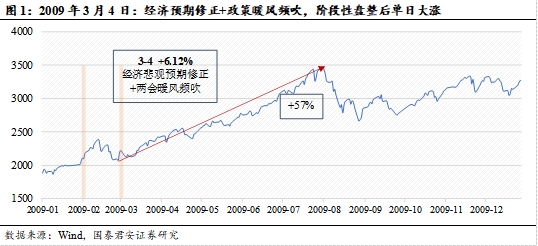 历史上,盘整后的大涨是因为什么?年后的市场,我们可以看到明显的2个信号:以上证综指为例,2月25日的5.60%以及本周五的3.20%。以此为标准,我们筛选历史上类似的时点,以探究盘整之后的大涨是何原因。回溯历史,找到近似的3个时间点:1)2016年,经历年初的“熔断”,3月2日上证综指上涨4.26%确定上涨趋势,但在5月进入盘整期,5月31日上涨3.34%,而后市场从2900点上涨至3200点。 2016年5月31日的大幅上涨,是受到6月纳入MSCI指数概率提升以及深港通落地时间临近的双重催化,券商保险等金融股强势爆发。2)2015年4月16日上证综指上涨2.71%,4月累计上涨18%,经历5月上半月的盘整,5月19日当日上涨3.13%,而后市场从4300点上涨至5178点。 2015年5月19日的大涨是因为市场关注的国企改革、新兴产业等事件进一步升温(5月18日国务院办公厅发布的《关于2015年深化经济体制改革重点工作意见的通知》、中国北车正式退出、上交所领导再次强调“战略新兴产业板”等),国企改革概念股、科技股强势爆发。3)2009年2月6日上证综指上涨3.97%而后在2月中下旬进入盘整,3月4日当日上涨6.12%,而后市场从2200点上涨至3478点。 2009年3月4日的大涨是因为基本面的悲观预期的修正,一方面是对于经济预期的大幅修正(从2008年11月的38.8修复至2009年2月的49,3月为52.4),另一方面是两会期间政策暖风不断,因此当日银行 保险大幅拉升、上证50上涨6.88%。
