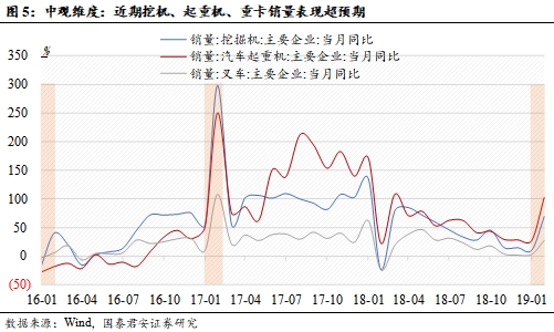 为什么我们认为一季度的基本面比大家想的好?早周期领域改善明显超预期。资本支出领域,挖机、起重机、重卡等销售表现超预期。资本支出方面已经开始出现超预期表现,2月份主要企业挖掘机销量当月同比达到68.68%,为2018年6月以来高点,而主要企业汽车起重机销量当月同比达到101.8%,为2018年2月以来新高,2018年12月重卡(主要包括半挂牵引车、重型货车、重卡底盘)销量同比为25%,前值为5%。从国泰君安证券研究在安徽、山东、河南等地区主机厂经销商行业调研来看,预计3月各类机械产品增长较好,这就意味着资本支出领域的超预期表现将会延续。基于调研分项看:挖机1-2月销量增长40%,主流厂商预估3月增长20-30%;起重机1-2月增速超55%,预估3月增长30%,全年30%左右;桩工机械以旋挖钻为例,1-2月增长近50%,预估3月30%,全年20%左右;混凝土泵车1-2月翻倍,预估3月70%,全年70-80%增长,搅拌站、搅拌车1-2月也有40-50%增长,全年保持乐观。固定资产投资完成额增速自2018年9月以来持续上行,目前仍处于改善趋势中,2019年2月累计同比6.1%。