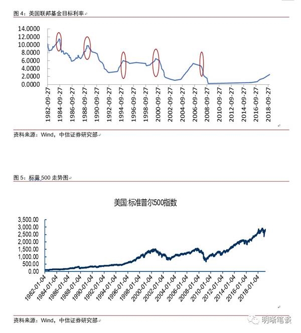 ②货币政策的影响。货币政策宽松,流动性好转,利好风险资产——去年12月份以来的美股反转就是这个逻辑。但是,在宽松周期开始时,实体经济可能仍然面临下行的压力,即便货币政策转为宽松,股市表现也不一定好。下图展示了美国货币宽松的时间和美股(以标普500为例)的走势。