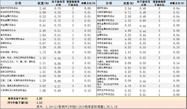 我们得到,按照现有的增值税调整规则,考虑到各项商品在CPI里面的权重,对于CPI包含的这一揽子商品增值税税率实际上下调了0.55%;同样可计算PPI,对于PPI包含的这一揽子商品,增值税税率实际上下调了1.4%。