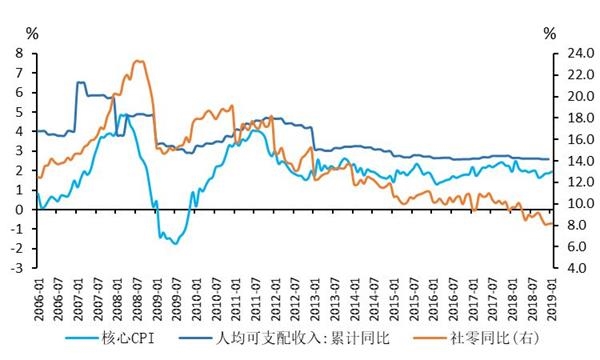 当前,我们对年内的经济判断是企稳,四个季度都维持在6.4%,和18年四季度持平,因此预计核心通胀难有大的波动。