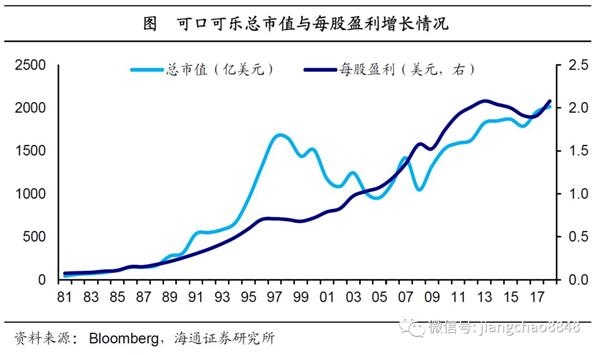 必需消费也有亮点,可口可乐稳健增长。在消费结构升级的浪潮下,必需消费中同样存在着投资亮点,受益于行业集中度上升,可口可乐公司的市值规模和盈利水平从80年代以来屡创新高、稳健增长。81年其每股盈利仅有0.08美元,而18年已经接近2.1美元,约是81年的26倍,市值规模也从81年的43亿美元左右增长到18年的超过2000亿美元。巴菲特也曾表示,其最成功的投资就是投资可口可乐公司。